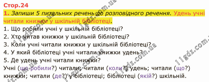 Запиши 5 питальних речень до розповідного речення. Удень учні читали книжки у шкільній бібліотеці. 1. Що робили учні у шкільній бібліотеці? 2. Хто читав книжки у шкільній бібліотеці? 3. Коли учні читали книжки у шкільній бібліотеці? 4. У який бібліотеці учні читали книжки удень? 5. Де удень учні читали книжки? Учні (що робили?) читали; читали (коли?) удень; читали (що?) книжки; читали (де?) у бібліотеці; бібліотеці (якій?) шкільній.