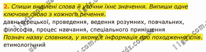 2. Спиши виділені слова й уточни їхнє значення. Випиши одне ключове слово з кожного речення. давньогрецької, проведення, ведення розумних, повчальних, філософів, процес навчання, спеціального приміщення Познач назву словника, у якому є інформація про походження слів. етимологічний