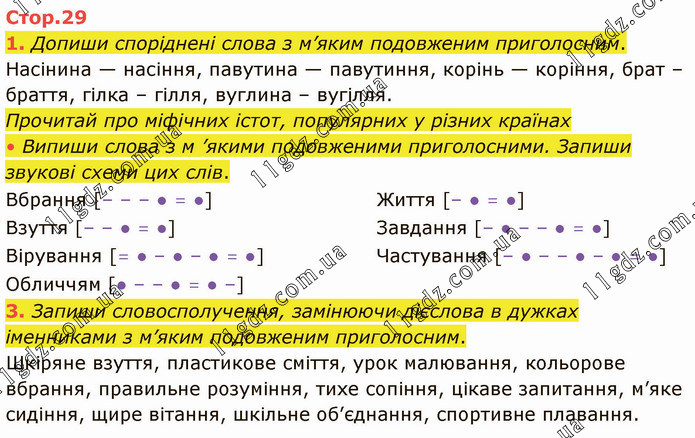 Допиши споріднені слова з м’яким подовженим приголосним. Насінина — насіння, павутина — павутиння, корінь — коріння, брат – браття, гілка – гілля, вуглина – вугілля. Прочитай про міфічних істот, популярних у різних країнах • Випиши слова з м ’якими подовженими приголосними. Запиши звукові схеми цих слів. Вбрання [– – – ● ᐀ ●] Взуття [– – ● ᐀ ●] Вірування [᐀ ● – ● – ● ᐀ ●] Обличчям [● – – ● ᐀ ● –] Життя [– ● ᐀ ●] Завдання [– ● – – ● ᐀ ●] Частування [– ● – – ● – ● ᐀ ●] 3. Запиши словосполучення, замінюючи дієслова в дужках іменниками з м’яким подовженим приголосним. Шкіряне взуття, пластикове сміття, урок малювання, кольорове вбрання, правильне розуміння, тихе сопіння, цікаве запитання, м’яке сидіння, щире вітання, шкільне об’єднання, спортивне плавання.