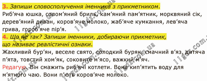 Запиши словосполучення іменника з прикметником. Риб’яча юшка, солом’яний бриль, кам’яний пам’ятник, морквяний сік, дерев’яний диван, коров’яче молоко, жаб’яче кумкання, лев’яча грива, гороб’яче пір’я. 4. Що не так? Запиши іменники, добираючи прикметник, що називає реалістичні ознаки. Жахливий бур’ян, веселе свято, солодкий буряк, смачний в’яз, дитяча п’ята, товстий хом’як, соковите м’ясо, важкий м’яч. Редагую. Він смажить риб’ячі котлети. Вона кип’ятить воду для м’ятного чаю. Вони п’ють коров’яче молоко.