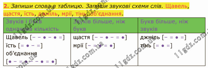 Запиши слова в таблицю. Запиши звукові схеми слів. Щавель, щастя, їсть, джміль, мрії, тінь, об’єднання. Звуків і букв однакова кількість Звуків більше, ніж букв Букв більше, ніж звуків Щавель [– – ● – ● ᐀] їсть [᐀ ● – ᐀] об’єднання [● – ᐀ ● – – ● ᐀ ●] щастя [– – ● – ᐀ ●] мрії [– ᐀ ● ᐀ ●] джміль [– ᐀ ● ᐀] тінь [᐀ ● ᐀]