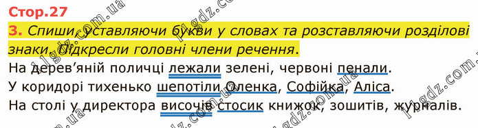 Спиши, уставляючи букви у словах та розставляючи розділові знаки. Підкресли головні члени речення. На дерев’яній поличці лежали зелені, червоні пенали. У коридорі тихенько шепотіли Оленка, Софійка, Аліса. На столі у директора височів стосик книжок, зошитів, журналів.