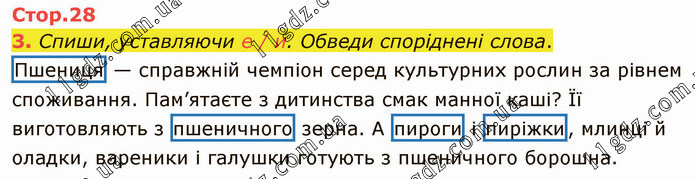 Спиши, уставляючи е / и. Обведи споріднені слова. Пшениця — справжній чемпіон серед культурних рослин за рівнем споживання. Пам’ятаєте з дитинства смак манної каші? Її виготовляють з пшеничного зерна. А пироги і пиріжки, млинці й оладки, вареники і галушки готують з пшеничного борошна.
