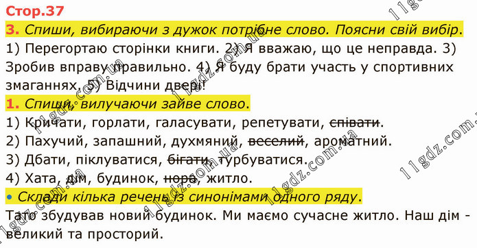 Спиши, вибираючи з дужок потрібне слово. Поясни свій вибір. 1) Перегортаю сторінки книги. 2) Я вважаю, що це неправда. 3) Зробив вправу правильно. 4) Я буду брати участь у спортивних змаганнях. 5) Відчини двері! 1. Спиши, вилучаючи зайве слово. 1) Кричати, горлати, галасувати, репетувати, співати. 2) Пахучий, запашний, духмяний, веселий, ароматний. 3) Дбати, піклуватися, бігати, турбуватися. 4) Хата, дім, будинок, нора, житло. • Склади кілька речень із синонімами одного ряду. Тато збудував новий будинок. Ми маємо сучасне житло. Наш дім - великий та просторий.