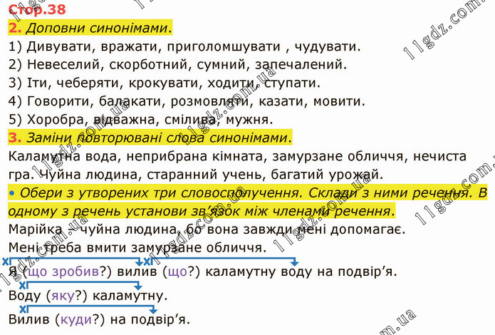 Доповни синонімами. 1) Дивувати, вражати, приголомшувати , чудувати. 2) Невеселий, скорботний, сумний, запечалений. 3) Іти, чеберяти, крокувати, ходити, ступати. 4) Говорити, балакати, розмовляти, казати, мовити. 5) Хоробра, відважна, смілива, мужня. 3. Заміни повторювані слова синонімами. Каламутна вода, неприбрана кімната, замурзане обличчя, нечиста гра. Чуйна людина, старанний учень, багатий урожай. • Обери з утворених три словосполучення. Склади з ними речення. В одному з речень установи зв’язок між членами речення. Марійка – чуйна людина, бо вона завжди мені допомагає. Мені треба вмити замурзане обличчя. Я (що зробив?) вилив (що?) каламутну воду на подвір’я. Воду (яку?) каламутну. Вилив (куди?) на подвір’я.