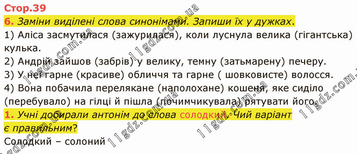Заміни виділені слова синонімами. Запиши їх у дужках. 1) Аліса засмутилася (зажурилася), коли луснула велика (гігантська) кулька. 2) Андрій зайшов (забрів) у велику, темну (затьмарену) печеру. 3) У неї гарне (красиве) обличчя та гарне ( шовковисте) волосся. 4) Вона побачила перелякане (наполохане) кошеня, яке сиділо (перебувало) на гілці й пішла (почимчикувала) рятувати його. 1. Учні добирали антонім до слова солодкий. Чий варіант є правильним? Солодкий – солоний
