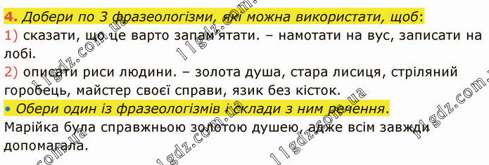 Добери по 3 фразеологізми, які можна використати, щоб: 1) сказати, що це варто запам’ятати. – намотати на вус, записати на лобі. 2) описати риси людини. – золота душа, стара лисиця, стріляний горобець, майстер своєї справи, язик без кісток. • Обери один із фразеологізмів і склади з ним речення. Марійка була справжньою золотою душею, адже всім завжди допомагала.