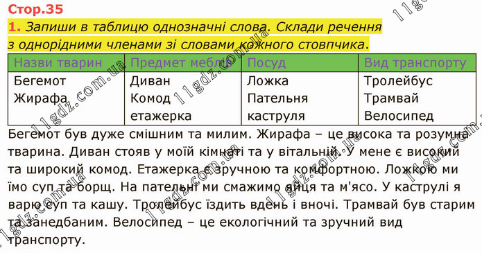 Запиши в таблицю однозначні слова. Склади речення з однорідними членами зі словами кожного стовпчика. Бегемот був дуже смішним та милим. Жирафа – це висока та розумна тварина. Диван стояв у моїй кімнаті та у вітальній. У мене є високий та широкий комод. Етажерка є зручною та комфортною. Ложкою ми їмо суп та борщ. На пательні ми смажимо яйця та м'ясо. У каструлі я варю суп та кашу. Тролейбус їздить вдень і вночі. Трамвай був старим та занедбаним. Велосипед – це екологічний та зручний вид транспорту.
