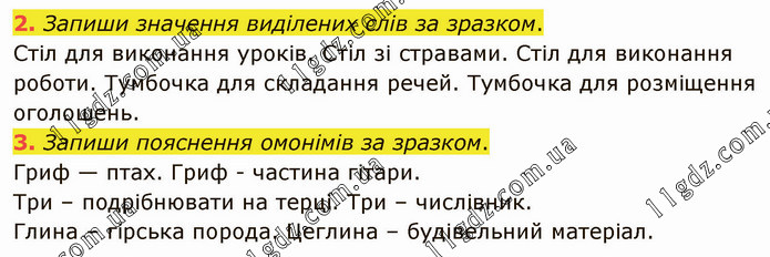 Запиши значення виділених слів за зразком. Стіл для виконання уроків. Стіл зі стравами. Стіл для виконання роботи. Тумбочка для складання речей. Тумбочка для розміщення оголошень. 3. Запиши пояснення омонімів за зразком. Гриф — птах. Гриф - частина гітари. Три – подрібнювати на терці. Три – числівник. Глина – гірська порода. Цеглина – будівельний матеріал.