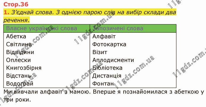 З’єднай слова. З однією парою слів на вибір склади два речення. Власне українські слова Абетка Світлина Відвідини Оплески Книгозбірня Відстань Водограй Запозичені слова Алфавіт Фотокартка Візит Аплодисменти Бібліотека Дистанція Фонтан