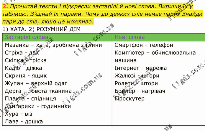 Прочитай тексти і підкресли застарілі й нові слова. Випиши їх у таблицю. З’єднай їх парами. Чому до деяких слів немає пари? Знайди пари до слів, якщо це можливо. 1) ХАТА. 2) РОЗУМНИЙ ДІМ Застарілі слова Мазанка – хата, зроблена з глини Стріха - дах Скіпка - тріска Кадіб - діжка Скриня - ящик Жупан – верхній одяг Дерга – товста тканина Плахта - спідниця Дзиґарики - годинники Хура - віз Лава - дошка Нові слова Смартфон - телефон Комп’ютер – обчислювальна машина Інтернет - мережа Жалюзі - штори Ролети - штори Бойлер - нагрівач Гіроскутер