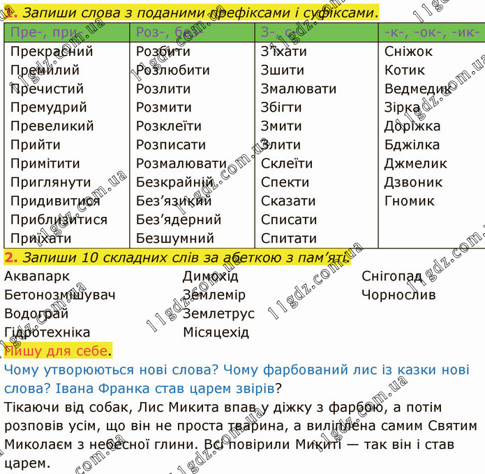 Запиши слова з поданими префіксами і суфіксами. Пре-, при- Прекрасний Премилий Пречистий Премудрий Превеликий Прийти Примітити Приглянути Придивитися Приблизитися Приїхати Роз-, без- Розбити Розлюбити Розлити Розмити Розклеїти Розписати Розмалювати Безкрайній Без’язикий Без’ядерний Безшумний З-, с- З’їхати Зшити Змалювати Збігти Змити Злити Склеїти Спекти Сказати Списати Спитати -к-, -ок-, -ик- Сніжок Котик Ведмедик Зірка Доріжка Бджілка Джмелик Дзвоник Гномик 2. Запиши 10 складних слів за абеткою з пам’яті. Аквапарк Бетонозмішувач Водограй Гідротехніка Димохід Землемір Землетрус Місяцехід Снігопад Чорнослив Пишу для себе. Чому утворюються нові слова? Чому фарбований лис із казки нові слова? Івана Франка став царем звірів? Тікаючи від собак, Лис Микита впав у діжку з фарбою, а потім розповів усім, що він не проста тварина, а виліплена самим Святим Миколаєм з небесної глини. Всі повірили Микиті — так він і став царем.