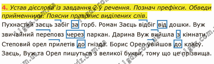 Устав дієслова із завдання 2 у речення. Познач префікси. Обведи прийменники. Поясни правопис виділених слів. Пухнастий заєць забіг за горб. Роман Заєць відбіг від дошки. Вуж звичайний переповз через паркан. Дарина Вуж вийшла з кімнати. Степовий орел прилетів до гнізда. Борис Орел увійшов до класу. Заєць, Вуж та Орел пишуться з великої букви, тому що це прізвища.
