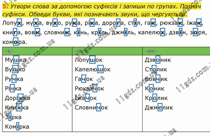 Утвори слова за допомогою суфіксів і запиши по групах. Познач суфікси. Обведи букви, які позначають звуки, що чергуються. Лопух, муха, вухо, рука, ріка, дорога, стіл, гак, рюкзак, їжак, книга, вовк, словник, кінь, кріль, джміль, капелюх, дзвін, зоря, комора.