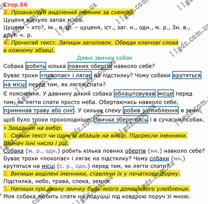 Проаналізуй виділений іменник за схемою. Цуценя відчуло запах м’яса. Цуценя – хто?, ім., п. ф. – цуценя, іст., заг. н., одн., м. р., Зн. в., друг. ч. р. 4. Прочитай текст. Запиши заголовок. Обведи ключові слова в кожному абзаці. Дивні звички собак Собака робить кілька повних обертів навколо себе? Буває трохи «покопає» і лягає на підстилку? Чому собаки крутяться на місці перед тим, як лягти спати? Є пояснення. У давнину дикий собака облаштовував місце перед тим, як лягти спати просто неба. Обертаючись навколо себе, приминав траву або сніг. У сильну спеку робив заглиблення в землі, щоб було трохи прохолодніше. Звичка збереглась і в сучасних собак. • Завдання на вибір. 1. Спиши текст чи один із абзаців на вибір. Підкресли іменники. Визнач їхні число і рід. Собака (ж. р., одн.) робить кілька повних обертів (мн.) навколо себе? Буває трохи «покопає» і лягає на підстилку? Чому собаки (мн.) крутяться на місці (с. р., одн.) перед тим, як лягти спати? 2. Випиши виділені іменники, ставлячи їх у початкову форму. Підстилка, небо, трава, спека, земля. 3. Напиши про дивну звичку будь-якого домашнього улюбленця. Моя собака любить спати на подушці під ковдрою поруч зі мною.
