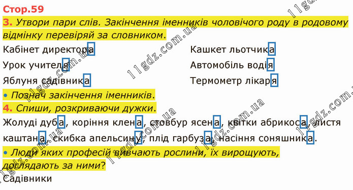 Утвори пари слів. Закінчення іменників чоловічого роду в родовому відмінку перевіряй за словником. Кабінет директора Урок учителя Яблуня садівника Кашкет льотчика Автомобіль водія Термометр лікаря • Познач закінчення іменників. 4. Спиши, розкриваючи дужки. Жолуді дуба, коріння клена, стовбур ясена, квітки абрикоса, листя каштана, скибка апельсину, плід гарбуза, насіння соняшника. • Люди яких професій вивчають рослини, їх вирощують, доглядають за ними? Садівники