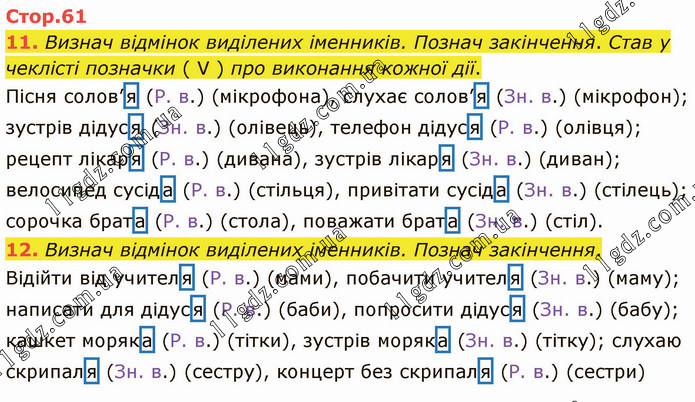 Визнач відмінок виділених іменників. Познач закінчення. Став у чеклісті позначки ( V ) про виконання кожної дії. Пісня солов’я (Р. в.) (мікрофона), слухає солов’я (Зн. в.) (мікрофон); зустрів дідуся (Зн. в.) (олівець), телефон дідуся (Р. в.) (олівця); рецепт лікаря (Р. в.) (дивана), зустрів лікаря (Зн. в.) (диван); велосипед сусіда (Р. в.) (стільця), привітати сусіда (Зн. в.) (стілець); сорочка брата (Р. в.) (стола), поважати брата (Зн. в.) (стіл). 12. Визнач відмінок виділених іменників. Познач закінчення. Відійти від учителя (Р. в.) (мами), побачити учителя (Зн. в.) (маму); написати для дідуся (Р. в.) (баби), попросити дідуся (Зн. в.) (бабу); кашкет моряка (Р. в.) (тітки), зустрів моряка (Зн. в.) (тітку); слухаю скрипаля (Зн. в.) (сестру), концерт без скрипаля (Р. в.) (сестри)