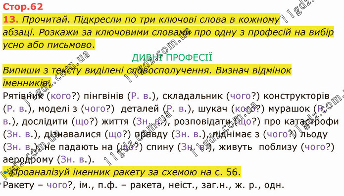 Прочитай. Підкресли по три ключові слова в кожному абзаці. Розкажи за ключовими словами про одну з професій на вибір усно або письмово. ДИВНІ ПРОФЕСІЇ Випиши з тексту виділені словосполучення. Визнач відмінок іменників. Рятівник (кого?) пінгвінів (Р. в.), складальник (чого?) конструкторів (Р. в.), моделі з (чого?) деталей (Р. в.), шукач (кого?) мурашок (Р. в.), дослідити (що?) життя (Зн. в.), розповідати (що?) про катастрофи (Зн. в.), дізнавалися (що?) правду (Зн. в.), піднімає з (чого?) льоду (Зн. в.), не падають на (що?) спину (Зн. в.), живуть поблизу (чого?) аеродрому (Зн. в.). • Проаналізуй іменник ракету за схемою на с. 56. Ракету – чого?, ім., п.ф. – ракета, неіст., заг.н., ж. р., одн.