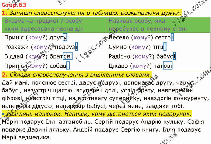 Склади словосполучення з виділеними словами. Дай мамі, пояснює сестрі, дарує подрузі, допомагає другу, чарує бабусі, назустріч щастю, всупереч долі, услід брату, навперейми діброві, навстріч тітці, на противагу супернику, навздогін конкуренту, напереріз дідусю, наперекір бабусі, через мене, завдяки тобі. • Розглянь малюнок. Напиши, кому дістанеться який подарунок. Марія подарує Іллі автомобіль. Сергій подарує Андрію кульку. Софія подаркє Дарині ляльку. Андрій подарує Сергію книгу. Ілля подарує Марії ведмедика.