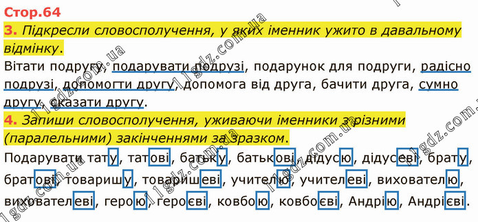 Підкресли словосполучення, у яких іменник ужито в давальному відмінку. Вітати подругу, подарувати подрузі, подарунок для подруги, радісно подрузі, допомогти другу, допомога від друга, бачити друга, сумно другу, сказати другу. 4. Запиши словосполучення, уживаючи іменники з різними (паралельними) закінченнями за зразком. Подарувати тату, татові, батьку, батькові, дідусю, дідусеві, брату, братові, товаришу, товаришеві, учителю, учителеві, вихователю, вихователеві, герою, героєві, ковбою, ковбоєві, Андрію, Андрієві.