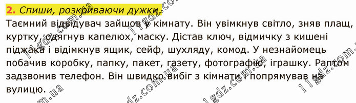 Спиши, розкриваючи дужки. Таємний відвідувач зайшов у кімнату. Він увімкнув світло, зняв плащ, куртку, одягнув капелюх, маску. Дістав ключ, відмичку з кишені піджака і відімкнув ящик, сейф, шухляду, комод. У незнайомець побачив коробку, папку, пакет, газету, фотографію, іграшку. Раптом задзвонив телефон. Він швидко вибіг з кімнати і попрямував на вулицю.