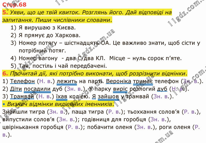 Уяви, що це твій квиток. Розглянь його. Дай відповіді на запитання. Пиши числівники словами. 1) Я вирушаю з Києва. 2) Я прямує до Харкова. 3) Номер потягу – шістнадцять ОА. Це важливо знати, щоб сісти у потрібний потяг. 4) Номер вагону - два С/два КЛ. Місце – нуль сорок п’яте. 5) Так, постіль і чай передбачені. 6. Прочитай дії, які потрібно виконати, щоб розрізнити відмінки. 1) Телефон (Н. в.) лежить на парті. Вероніка тримає телефон (Зн. в.). 2) Діти посадили дуб (Зн. в.). У парку виріс розлогий дуб (Н. в.). 3) Трамвай (Н. в.) їхав колією. Я зайшов у трамвай (Зн. в.). • Визнач відмінки виділених іменників. Знайшли тигра (Зн. в.), паща тигра (Р. в.); тьохкання солов’я (Р. в.), випустили солов’я (Зн. в.); годівниця для горобця (Зн. в.), цвірінькання горобця (Р. в.); побачити оленя (Зн. в.), роги оленя (Р. в.).