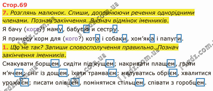 Розглянь малюнок. Спиши, доповнюючи речення однорідними членами. Познач закінчення. Визнач відмінок іменників. Я бачу (кого?) маму, бабусю и сестру. Я принесу корм для (кого?) кота і собаки, хом’яка і папуги. 1. Що не так? Запиши словосполучення правильно. Познач закінчення іменників. Смакувати борщем, сидіти під кущем; накривати плащем, грати м’ячем; сніг із дощем, їхати трамваєм; милуватись обрієм, хвалитися урожаєм; писати олівцем, помінятися стільцем, співати з горобцем.