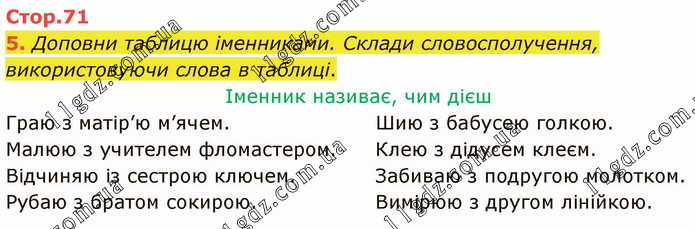 Доповни таблицю іменниками. Склади словосполучення, використовуючи слова в таблиці. Іменник називає, чим дієш Граю з матір’ю м’ячем. Малюю з учителем фломастером. Відчиняю із сестрою ключем. Рубаю з братом сокирою. Шию з бабусею голкою. Клею з дідусем клеєм. Забиваю з подругою молотком. Вимірюю з другом лінійкою.