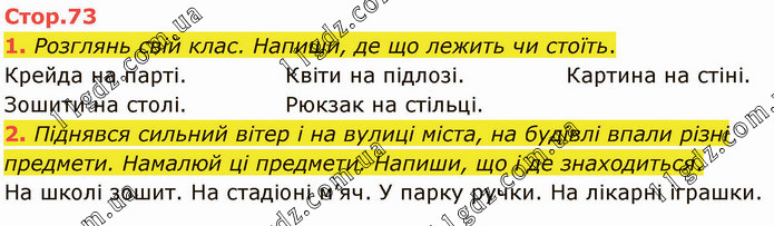 Розглянь свій клас. Напиши, де що лежить чи стоїть. Крейда на парті. Зошити на столі. Квіти на підлозі. Рюкзак на стільці. Картина на стіні. 2. Піднявся сильний вітер і на вулиці міста, на будівлі впали різні предмети. Намалюй ці предмети. Напиши, що і де знаходиться. На школі зошит. На стадіоні м’яч. У парку ручки. На лікарні іграшки.