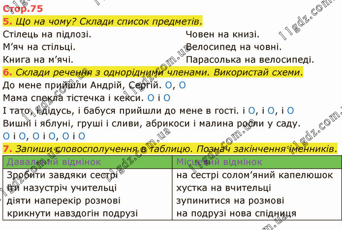 Що на чому? Склади список предметів. Стілець на підлозі. М’яч на стільці. Книга на м’ячі. Човен на книзі. Велосипед на човні. Парасолька на велосипеді. 6. Склади речення з однорідними членами. Використай схеми. До мене прийшли Андрій, Сергій. О, О Мама спекла тістечка і кекси. О і О І тато, і дідусь, і бабуся прийшли до мене в гості. і О, і О, і О Вишні і яблуні, груші і сливи, абрикоси і малина росли у саду. О і О, О і О, О і О 7. Запиши словосполучення в таблицю. Познач закінчення іменників. Давальний відмінок Зробити завдяки сестрі іти назустріч учительці діяти наперекір розмові крикнути навздогін подрузі Місцевий відмінок на сестрі солом’яний капелюшок хустка на вчительці зупинитися на розмові на подрузі нова спідниця