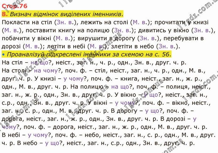 Визнач відмінок виділених іменників. Покласти на стіл (Зн. в.), лежить на столі (М. в.); прочитати у книзі (М. в.), поставити книгу на полицю (Зн. в.); дивитись у вікно (Зн. в.), побачити у вікні (М. в.); вирушити в дорогу (Зн. в.), перебувати в дорозі (М. в.); летіти в небі (М. в.), злетіти в небо (Зн. в.). • Проаналізуй підкреслені іменники за схемою на с. 56. На стіл – на що?, неіст., заг. н., ч. р., одн., Зн. в., друг. ч. р. На столі – на чому?, поч. ф. – стіл, неіст., заг. н., ч. р., одн., М. в., друг. ч. р. У книзі – у чому?, поч. ф. – книга, неіст., заг. н., ж. р., одн., М. в., друг. ч. р. На полицю – на що?, поч. ф. – полиця, неіст., заг. н., ж. р., одн., Зн. в., друг. ч. р. У вікно – у що?, неіст., заг. н., с.р., одн., Зн. в., друг. ч. р. У вікні – у чому?, поч. ф. – вікно, неіст., заг. н., с. р., одн., М. в., друг. ч. р. В дорогу – у що?, поч. ф. – дорога, неіст., заг. н., ж. р., одн., Зн. в., друг. ч. р. В дорозі – у чому?, поч. ф. – дорога, неіст., заг. н., ж. р., одн., М. в., друг. ч. р. В небі – у чому?, поч. ф. – небо, неіст., заг. н., с. р., одн., М. в., друг. ч. р. В небо – у що?, неіст., заг. н., с.р., одн., Зн. в., друг. ч. р.