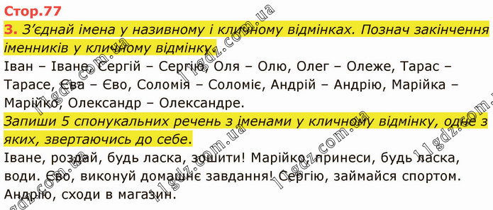 З’єднай імена у називному і кличному відмінках. Познач закінчення іменників у кличному відмінку. Іван – Іване, Сергій – Сергію, Оля – Олю, Олег – Олеже, Тарас – Тарасе, Єва – Єво, Соломія – Соломіє, Андрій – Андрію, Марійка – Марійко, Олександр – Олександре. Запиши 5 спонукальних речень з іменами у кличному відмінку, одне з яких, звертаючись до себе. Іване, роздай, будь ласка, зошити! Марійко, принеси, будь ласка, води. Єво, виконуй домашнє завдання! Сергію, займайся спортом. Андрію, сходи в магазин.