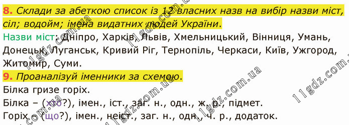 Склади за абеткою список із 12 власних назв на вибір назви міст, сіл; водойм; імена видатних людей України. Назви міст: Дніпро, Харків, Львів, Хмельницький, Вінниця, Умань, Донецьк, Луганськ, Кривий Ріг, Тернопіль, Черкаси, Київ, Ужгород, Житомир, Суми. 9. Проаналізуй іменники за схемою. Білка гризе горіх. Білка – (хто?), імен., іст., заг. н., одн., ж. р., підмет. Горіх – (що?), імен., неіст., заг. н., одн., ч. р., додаток.