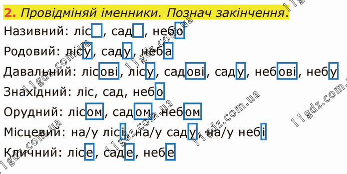 Провідміняй іменники. Познач закінчення. Називний: ліс , сад , небо Родовий: лісу, саду, неба Давальний: лісові, лісу, садові, саду, небові, небу Знахідний: ліс, сад, небо Орудний: лісом, садом, небом Місцевий: на/у лісі, на/у саду, на/у небі Кличний: лісе, саде, небе