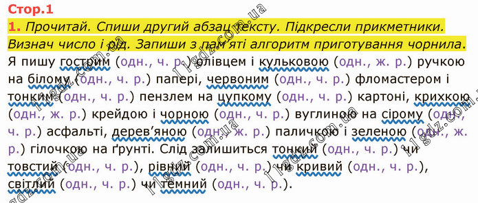 Прочитай. Спиши другий абзац тексту. Підкресли прикметники. Визнач число і рід. Запиши з пам’яті алгоритм приготування чорнила. Я пишу гострим (одн., ч. р.) олівцем і кульковою (одн., ж. р.) ручкою на білому (одн., ч. р.) папері, червоним (одн., ч. р.) фломастером і тонким (одн., ч. р.) пензлем на цупкому (одн., ч. р.) картоні, крихкою (одн., ж. р.) крейдою і чорною (одн., ч. р.) вуглиною на сірому (одн., ч. р.) асфальті, дерев’яною (одн., ж. р.) паличкою і зеленою (одн., ж. р.) гілочкою на ґрунті. Слід залишиться тонкий (одн., ч. р.) чи товстий (одн., ч. р.), рівний (одн., ч. р.) чи кривий (одн., ч. р.), світлий (одн., ч. р.) чи темний (одн., ч. р.). Проаналізуй виділені прикметники за зразком. Гострим (олівцем) — (яким?), прикм., одн., ч. р., другор. ч. р. Білому (папері) – (якому?), прикм., одн., ч. р., другор. ч. р. Дерев’яною (паличкою) – (якою?), прикм., одн., ж. р., другор. ч. р.