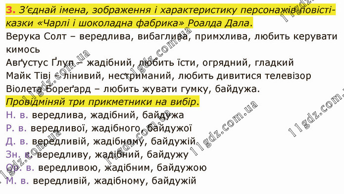 З’єднай імена, зображення і характеристику персонажів повісті-казки «Чарлі і шоколадна фабрика» Роалда Дала. Верука Солт – вередлива, вибаглива, примхлива, любить керувати кимось Авґустус Ґлуп – жадібний, любить їсти, огрядний, гладкий Майк Тіві – лінивий, нестриманий, любить дивитися телевізор Віолета Бореґард – любить жувати гумку, байдужа. Провідміняй три прикметники на вибір. Н. в. вередлива, жадібний, байдужа Р. в. вередливої, жадібного, байдужої Д. в. вередливій, жадібному, байдужій Зн. в. вередливу, жадібний, байдужу Ор. в. вередливою, жадібним, байдужою М. в. вередливій, жадібному, байдужій