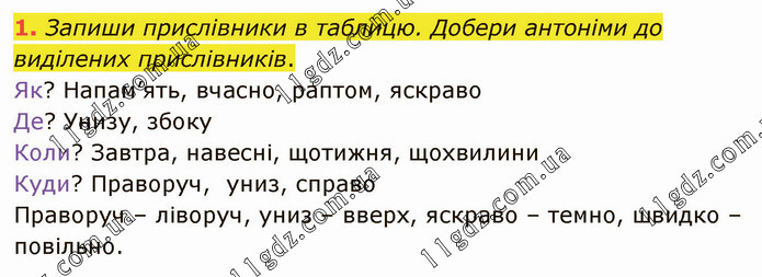 Запиши прислівники в таблицю. Добери антоніми до виділених прислівників. Як? Напам’ять, вчасно, раптом, яскраво Де? Унизу, збоку Коли? Завтра, навесні, щотижня, щохвилини Куди? Праворуч, униз, справо Праворуч – ліворуч, униз – вверх, яскраво – темно, швидко – повільно.