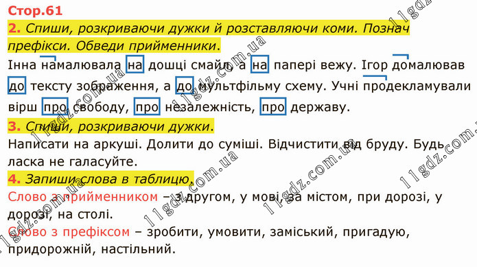 Спиши, розкриваючи дужки й розставляючи коми. Познач префікси. Обведи прийменники. Інна намалювала на дошці смайл, а на папері вежу. Ігор домалював до тексту зображення, а до мультфільму схему. Учні продекламували вірш про свободу, про незалежність, про державу. 3. Спиши, розкриваючи дужки. Написати на аркуші. Долити до суміші. Відчистити від бруду. Будь ласка не галасуйте. 4. Запиши слова в таблицю. Слово з прийменником – з другом, у мові, за містом, при дорозі, у дорозі, на столі. Слово з префіксом – зробити, умовити, заміський, пригадую, придорожній, настільний.