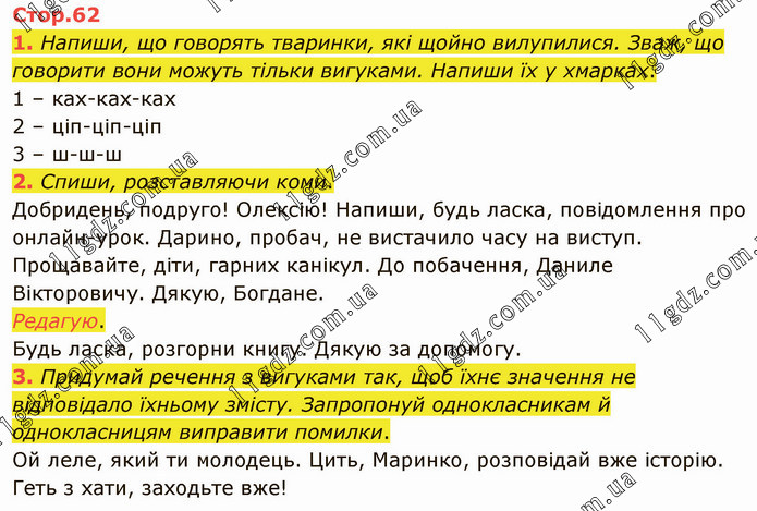 Напиши, що говорять тваринки, які щойно вилупилися. Зваж, що говорити вони можуть тільки вигуками. Напиши їх у хмарках. 1 – ках-ках-ках 2 – ціп-ціп-ціп 3 – ш-ш-ш 2. Спиши, розставляючи коми. Добридень, подруго! Олексію! Напиши, будь ласка, повідомлення про онлайн-урок. Дарино, пробач, не вистачило часу на виступ. Прощавайте, діти, гарних канікул. До побачення, Даниле Вікторовичу. Дякую, Богдане. Редагую. Будь ласка, розгорни книгу. Дякую за допомогу. 3. Придумай речення з вигуками так, щоб їхнє значення не відповідало їхньому змісту. Запропонуй однокласникам й однокласницям виправити помилки. Ой леле, який ти молодець. Цить, Маринко, розповідай вже історію. Геть з хати, заходьте вже!