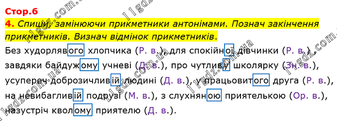 Спиши, замінюючи прикметники антонімами. Познач закінчення прикметників. Визнач відмінок прикметників. Без худорлявого хлопчика (Р. в.), для спокійної дівчинки (Р. в.) , завдяки байдужому учневі (Д. в.), про чутливу школярку (Зн. в.), усупереч доброзичливій людині (Д. в.), у працьовитого друга (Р. в.), на невибагливій подрузі (М. в.), з слухняною приятелькою (Ор. в.), назустріч кволому приятелю (Д. в.).