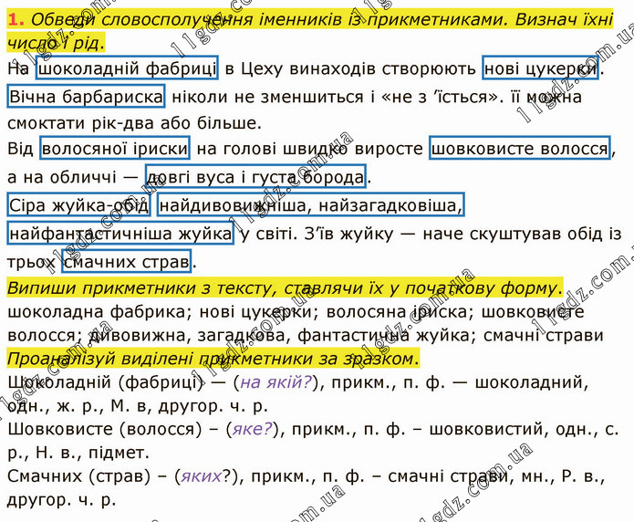 Обведи словосполучення іменників із прикметниками. Визнач їхні число і рід. На шоколадній фабриці в Цеху винаходів створюють нові цукерки. Вічна барбариска ніколи не зменшиться і «не з ’їсться». її можна смоктати рік-два або більше. Від волосяної іриски на голові швидко виросте шовковисте волосся, а на обличчі — довгі вуса і густа борода. Сіра жуйка-обід найдивовижніша, найзагадковіша, найфантастичніша жуйка у світі. З’їв жуйку — наче скуштував обід із трьох смачних страв. Випиши прикметники з тексту, ставлячи їх у початкову форму. шоколадна фабрика; нові цукерки; волосяна іриска; шовковисте волосся; дивовижна, загадкова, фантастична жуйка; смачні страви Проаналізуй виділені прикметники за зразком. Шоколадній (фабриці) — (на якій?), прикм., п. ф. — шоколадний, одн., ж. р., М. в, другор. ч. р. Шовковисте (волосся) – (яке?), прикм., п. ф. – шовковистий, одн., с. р., Н. в., підмет. Смачних (страв) – (яких?), прикм., п. ф. – смачні страви, мн., Р. в., другор. ч. р.