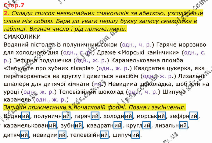 Склади список незвичайних смаколиків за абеткою, узгоджуючи слова між собою. Бери до уваги першу букву запису смаколика в таблиці. Визнач число і рід прикметників. СМАКОЛИКИ Водяний пістолет із полуничним соком (одн., ч. р.) Гаряче морозиво для холодного дня (одн., с. р.) Драже «Морські камінчики» (одн., с. р.) Зефірна подушечка (одн., ж. р.) Карамелькована пломба «Забудьте про зубних лікарів» (одн., ж. р.) Квадратна цукерка, яка перетворюється на круглу і дивиться навсібіч (одн., ж. р.) Лизальні шпалери для дитячої кімнати (мн.) Невидима шоколадка, щоб їсти на уроці (одн., ж. р.) Телевізійний шоколад (одн., ч. р.) Шипуча карамель (одн., ж. р.) Запиши прикметники в початковій формі. Познач закінчення. Водяний, полуничний, гарячий, холодний, морський, зефірний, карамелькований, зубний, квадратний, круглий, лизальний, дитячий, невидимий, телевізійний, шипучий.