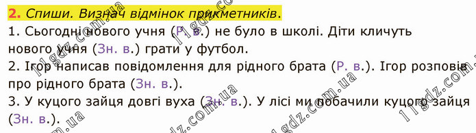 Спиши. Визнач відмінок прикметників. 1. Сьогодні нового учня (Р. в.) не було в школі. Діти кличуть нового учня (Зн. в.) грати у футбол. 2. Ігор написав повідомлення для рідного брата (Р. в.). Ігор розповів про рідного брата (Зн. в.). 3. У куцого зайця довгі вуха (Зн. в.). У лісі ми побачили куцого зайця (Зн. в.).