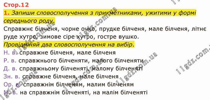 Запиши словосполучення з прикметниками, ужитими у формі середнього роду. Справжнє білченя, чорне очко, прудке білченя, мале білченя, літнє руде хутро, зимове сіре хутро, гостре вушко. Провідміняй два словосполучення на вибір. Н. в. справжне білченя, мале білченя Р. в. справжнього білченяти, малого білченяти Д. в. справжньому білченяті, малому білченяті Зн. в. справжне білченя, мале білченя Ор. в. справжнім білченям, малим білченям М. в. на справжнім білченяті, на малім білченяті
