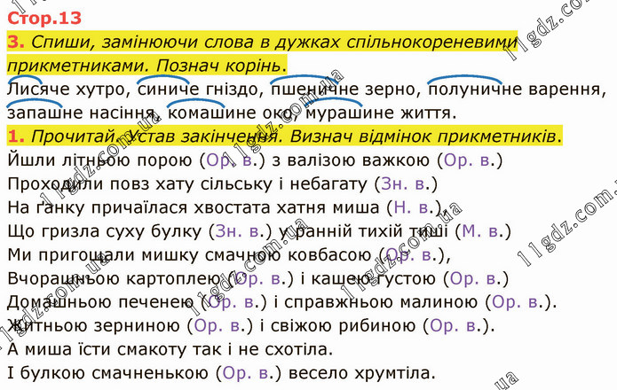 Спиши, замінюючи слова в дужках спільнокореневими прикметниками. Познач корінь. Лисяче хутро, синиче гніздо, пшеничне зерно, полуничне варення, запашне насіння, комашине око, мурашине життя. 1. Прочитай. Устав закінчення. Визнач відмінок прикметників. Йшли літньою порою (Ор. в.) з валізою важкою (Ор. в.) Проходили повз хату сільську і небагату (Зн. в.) На ґанку причаїлася хвостата хатня миша (Н. в.), Що гризла суху булку (Зн. в.) у ранній тихій тиші (М. в.) Ми пригощали мишку смачною ковбасою (Ор. в.), Вчорашньою картоплею (Ор. в.) і кашею густою (Ор. в.) Домашньою печенею (Ор. в.) і справжньою малиною (Ор. в.). Житньою зерниною (Ор. в.) і свіжою рибиною (Ор. в.). А миша їсти смакоту так і не схотіла. І булкою смачненькою (Ор. в.) весело хрумтіла.