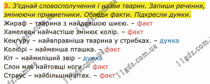 З’єднай словосполучення і назви тварин. Запиши речення, змінюючи прикметники. Обведи факти. Підкресли думки. Жираф – тварина з найдовшою шиєю. – факт Хамелеон найчастіше змінює колір. – факт Кенгуру – найвправніша тварина у стрибках. – думка Колібрі – найменша пташка. – факт Кіт – наймиліший звір – думка Слон має найтовщі ноги. – факт Страус – найбільший птах. – факт