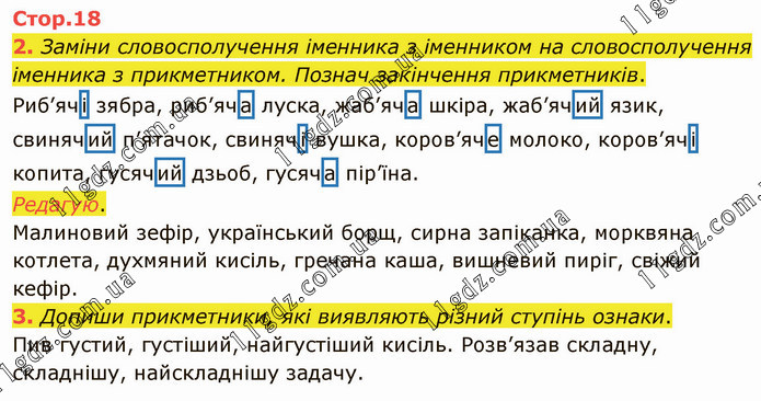 Заміни словосполучення іменника з іменником на словосполучення іменника з прикметником. Познач закінчення прикметників. Риб’ячі зябра, риб’яча луска, жаб’яча шкіра, жаб’ячий язик, свинячий п’ятачок, свинячі вушка, коров’яче молоко, коров’ячі копита, гусячий дзьоб, гусяча пір’їна. Редагую. Малиновий зефір, український борщ, сирна запіканка, морквяна котлета, духмяний кисіль, гречана каша, вишневий пиріг, свіжий кефір. 3. Допиши прикметники, які виявляють різний ступінь ознаки. Пив густий, густіший, найгустіший кисіль. Розв’язав складну, складнішу, найскладнішу задачу.