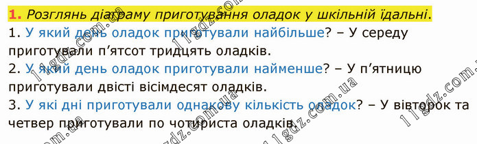 Розглянь діаграму приготування оладок у шкільній їдальні. 1. У який день оладок приготували найбільше? – У середу приготували п’ятсот тридцять оладків. 2. У який день оладок приготували найменше? – У п’ятницю приготували двісті вісімдесят оладків. 3. У які дні приготували однакову кількість оладок? – У вівторок та четвер приготували по чотириста оладків.
