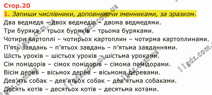 Запиши числівники, доповнюючи іменниками, за зразком. Два ведмедя – двох ведмедів – двома ведмедями. Три буряка – трьох буряків – трьома буряками. Чотири картоплі – чотирьох картоплин – чотирма картоплинами. П’ять завдань – п’ятьох завдань – п’ятьма завданнями. Шість уроків – шістьох уроків – шістьма уроками. Сім помідорів – сімох помідорів – сімома помідорами. Вісім дерев – вісьмох дерев – вісьмома деревами. Дев’ять собак – дев’ятьох собак – дев’ятьма собаками. Десять котів – десятьох котів – десятьма котами.