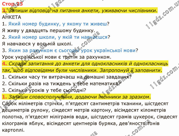 Запиши відповіді на питання анкети, уживаючи числівники. АНКЕТА 1. Який номер будинку, у якому ти живеш? Я живу у двадцять першому будинку. 2. Який номер школи, у якій ти навчаєшся? Я навчаюся у восьмій школі. 3. Яким за рахунком є сьогодні урок української мови? Урок української мови є третім за рахунком. 4. Склади запитання до анкети для однокласників й однокласниць так, щоб відповідями були числівники. Запропонуй її заповнити. 1. Скільки часу ти витрачаєш на домашні завдання? 2. Скільки разів на тиждень у тебе математика? 3. Скільки уроків у тебе сьогодні? 1. Запиши словосполучення, додаючи іменники за зразком. Сорок міліметрів стрічки, п’ятдесят сантиметрів тканини, шістдесят дециметрів рулону, сімдесят метрів картону, вісімдесят кілометрів полотна, п’ятдесят міліграмів води, шістдесят грамів цукерок, сімдесят кілограмів яблук, вісімдесят центнерів буряка, дев’яносто тонів картоплі.